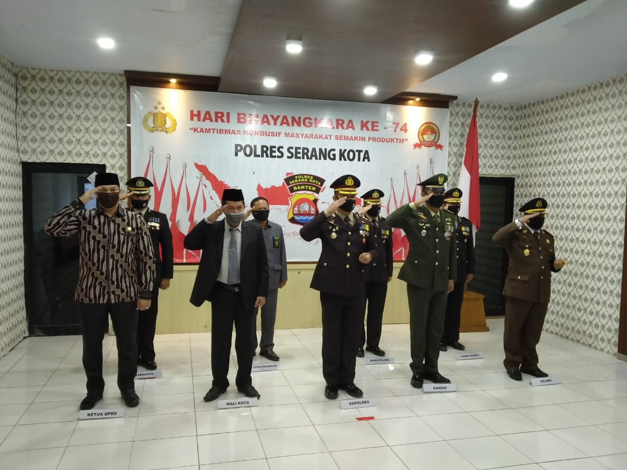 Polres Serang Kota Polda Banten melaksanakan upacara hari Bhayangkara ke 74 secara virtual di Gedung Sanika Satyawada Polres Serang Kota