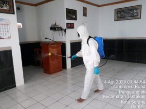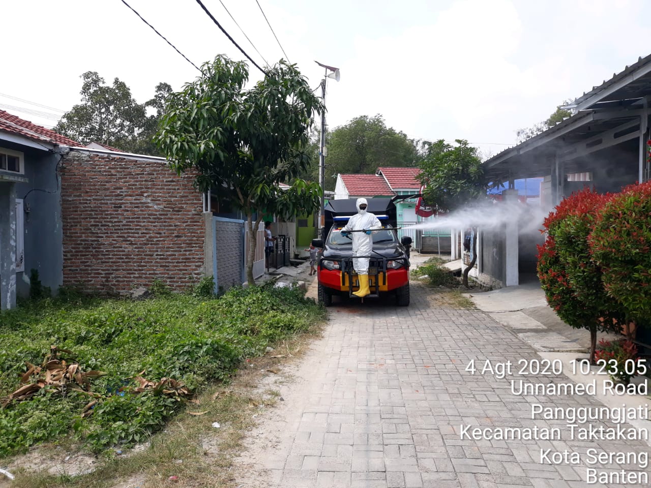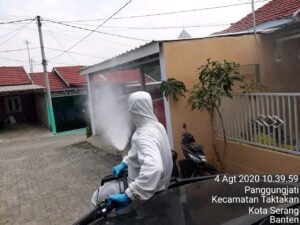 Di antaranya dengan melakukan penyemprotan disinfektan ke perumahan-perumahan yang ada di wilayah Kota Serang, salah satunya perumahan Ranau Estate Taktakan Kota Serang, Selasa (04/08/2020) pukul 09.00 wib.