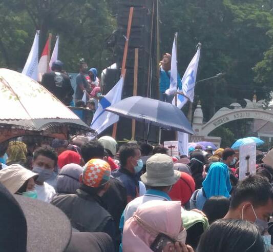 “UU Cipta Kerja (Ciptaker) jelas merugikan kita, kita akan terus lakukan aksi, kita dorong dewan kita untuk menyampaikan aspirasi penolakan UU Ciptaker ini,”teriak para buruh.