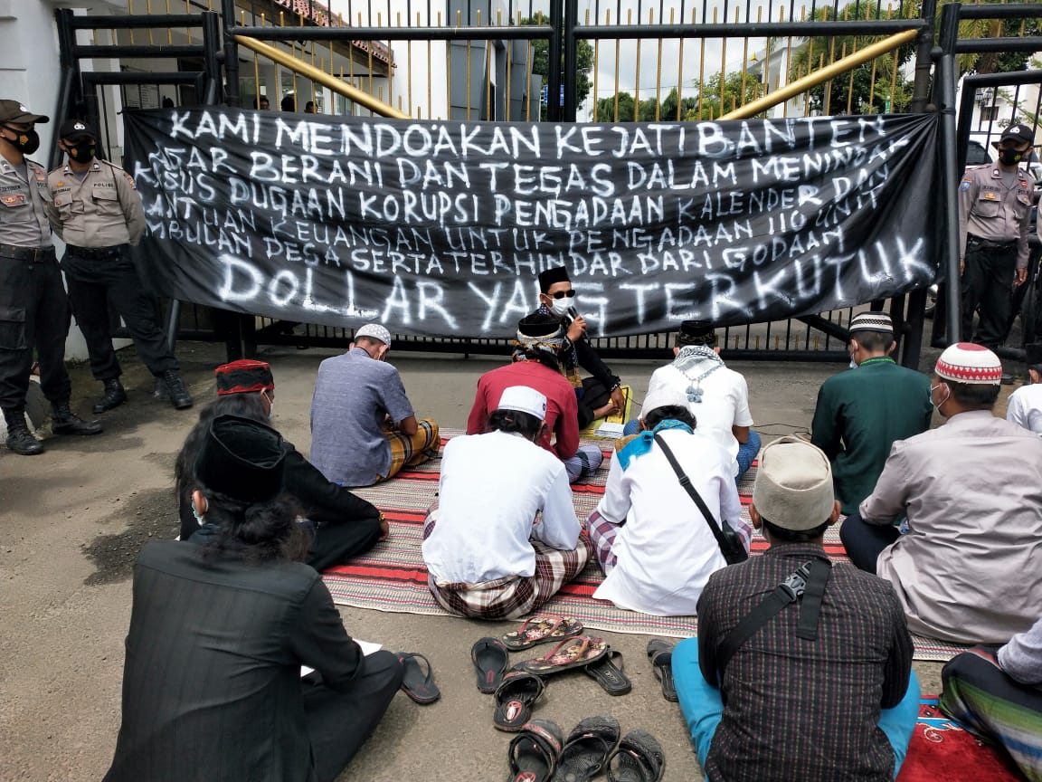 Tidak hanya itu, dalam rangkaian aksi, mereka juga membuat tulisan yang dipasang di pintu gerbang masuk Gedung Kejati Banten. Terlihat pada kain berwana hitam tertulis, “Kami mendoakan Kejati Banten agar berani, dan tegas dalam menindak kasus dugaan korupsi pengadaan kalender dan bantuan keuangan untuk pengadaan 110 unit ambulance desa serta terhindar dari godaan dolar yang terkutuk.
