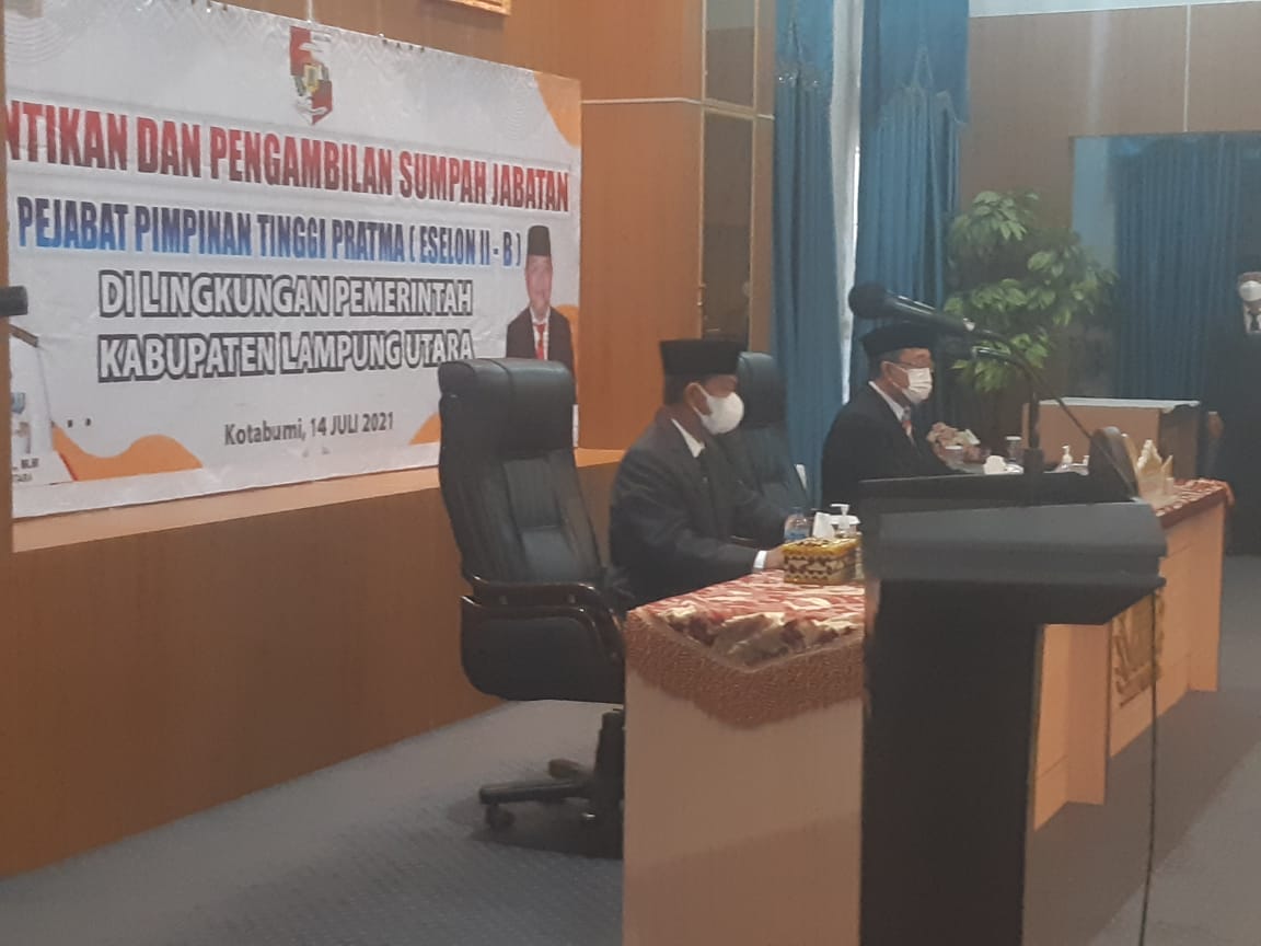 INFOXPOS.COM – KOTABUMI – Bupati Lampung Utara Hi. Budi Utomo, S.E., M.M., melantik dan mengambil sumpah Lima pejabat Eselon II di Rumah Jabatan Bupati, Rabu (14/07/2021). Pelantikan ini berdasarkan Surat Keputusan (SK) Bupati nomor : 821.21/1573/II/39-LU/2021 tanggal 14 Juli 2021 dengan menerapkan Protokol (Prokes) Kesehatan Covid-19.