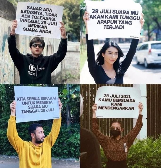 Infoxpos.com – Jakarta – Baru-baru ini beberapa artis di tanah air turun mengunggah foto sedang turun ke jalan sambil membawa kertas. Mereka mendadak mengangkat kertas dan bertuliskan ’28 Juli kutunggu suaramu’.
