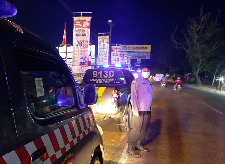 Tampak petugas menyampaikan pesan-pesan kamtibmas dan memberikan himbauan protokol kesehatan.