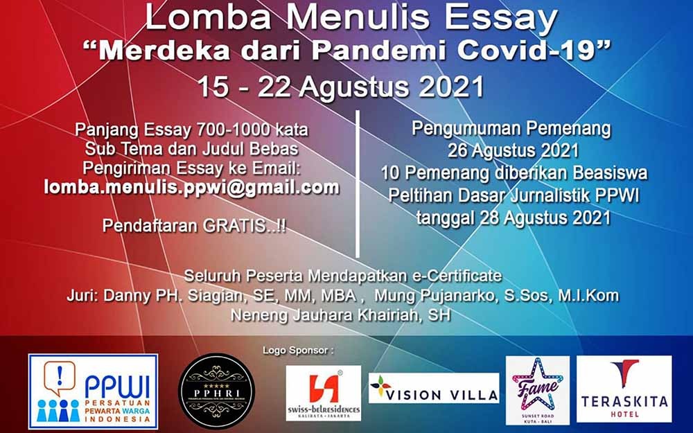 Infoxpos.com – Jakarta – Setelah memilah dan melakukan penjurian terhadap karya-karya essay yang masuk ke Panitia Lomba Menulis Essay bertema “Merdeka dari Pandemi Covid-19”, maka panitia dari Dewan Pengurus Nasional Persatuan Pewarta Warga Indonesia (DPN PPWI) menetapkan 10 nominator terbaik, yaitu: