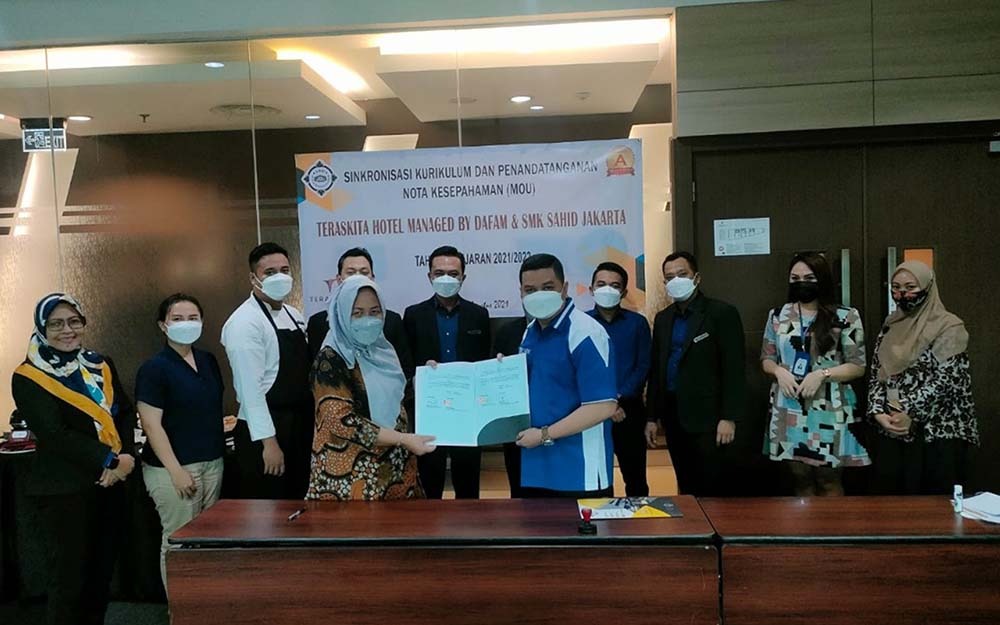 Setelah dilakukan beberapa persiapan, SMK Sahid Jakarta dan Terasita Hotel Jakarta managed by Dafam bertemu dan menandatangani MOU Kerjasama. Dari pihak Teraskita Hotel Jakarta managed by Dafam diwakili oleh General Manager, Ferry Febriari, sementara dari SMK Sahid Jakarta diwakili langsung oleh Kepala Sekolah, Sisca Tri Damarianingrum, S.Pd, MM. Hadir menampingi Kepala SMK Sahid Jakarta, Wakil Kepala Sekolah, Agus Yunianto, S.Pd; Kabid Humas dan Hubin, Oktofarita Rani Hidayati; dan Kepala Program Studi Kuliner, Alviani Kharisma Dewi, S.Pd.