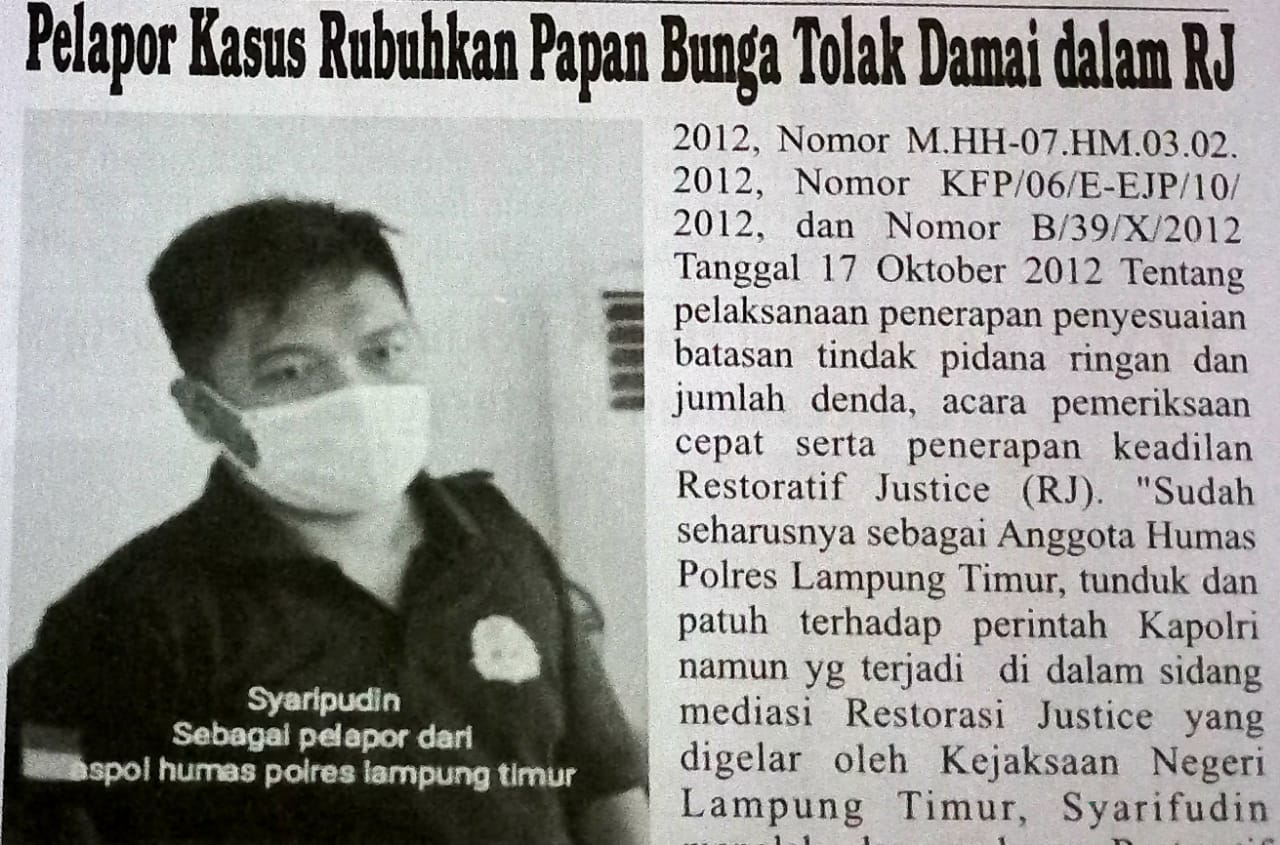 Hal itu disampaikan Wilson Lalengke kepada media ini terkait informasi yang beredar bahwa gagalnya mediasi pada acara Restorative Justice (RJ) yang digelar oleh Kejaksaan Negeri Lampung Timur beberapa waktu yang lalu disebabkan oleh penolakan SAF mencabut laporannya dan tidak mau memberi maaf kepada terlapor Wilson Lalengke dan kawan-kawannya. Sebagaimana diketahui bahwa Ketua Umum PPWI tersebut saat ini sedang menjalani proses hukum di Pengadilan Negeri Lampung Timur atas dugaan melakukan pengrusakan papan bunga pada Jumat, 11 Maret 2022, di Mapolres Lampung Timur yang dilaporkan oleh SAF.