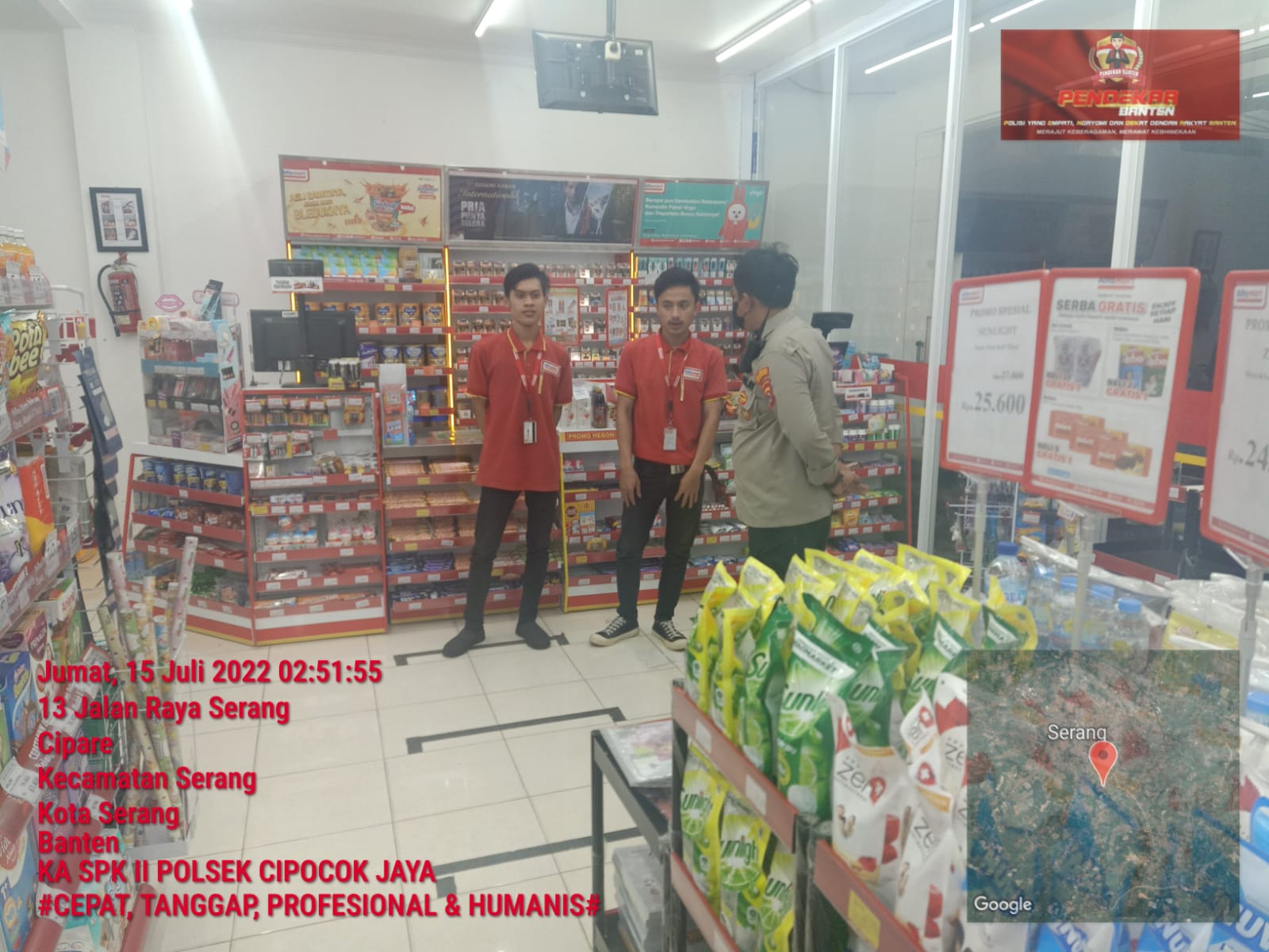 Dengan berpatroli Anggota Polsek Cipocok Jaya Polresta serkot gencarkan melakukan patroli kewilayahan dengan pantau waralaba dan tempat-tempat obyek vital yang berada di wilayah Kecamatan Cipocok Jaya guna mengantisipasi gangguan Kamtibmas”.