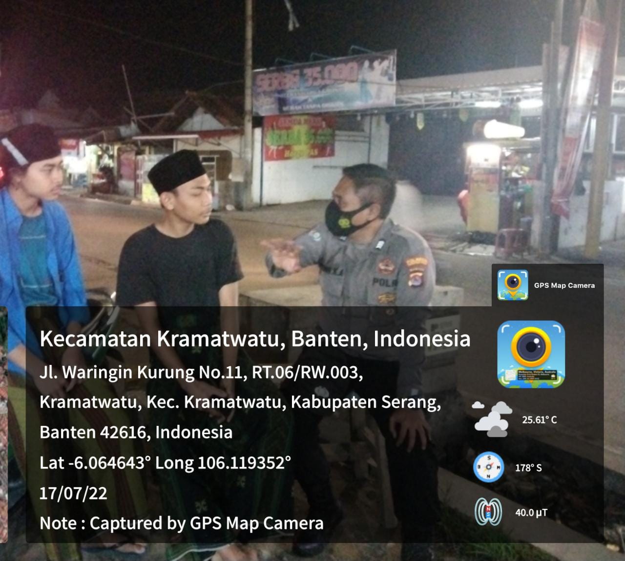 Polresta Serkot | Personil Polsek Kramatwatu Polresta Serkot Polda Banten terus melakukan upaya untuk mencegah penyebaran covid-19 serta tindak kejahatan pada malam hari dengan rutin melaksanakan patroli malam di wilayah hukum Polsek Kramatwatu Polresta Serkot. Senin, (18/7/2022).
