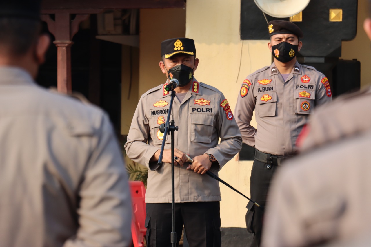 POLRESTA SERKOT_ Kapolresta Serang Kota Polda Banten Kombes Pol. Nugroho Arianto, pimpin apel pagi di halaman apel Polresta Serang Kota pada Senin, (18/07).