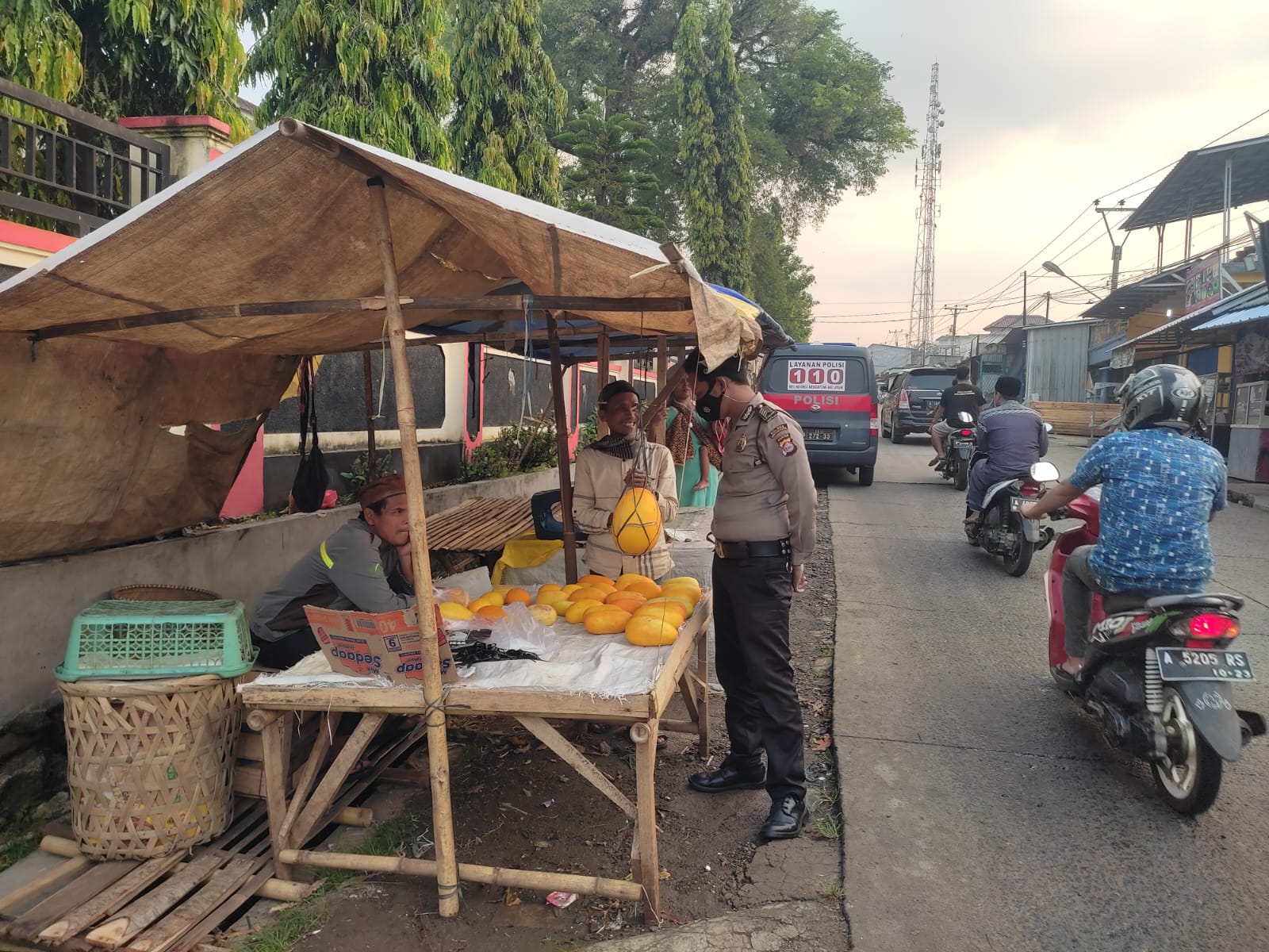 Briptu Ade dan Briptu Ilham lakukan patroli dan menghampiri pedagang timun Suri kemudian berikan pesan kamtibmas.