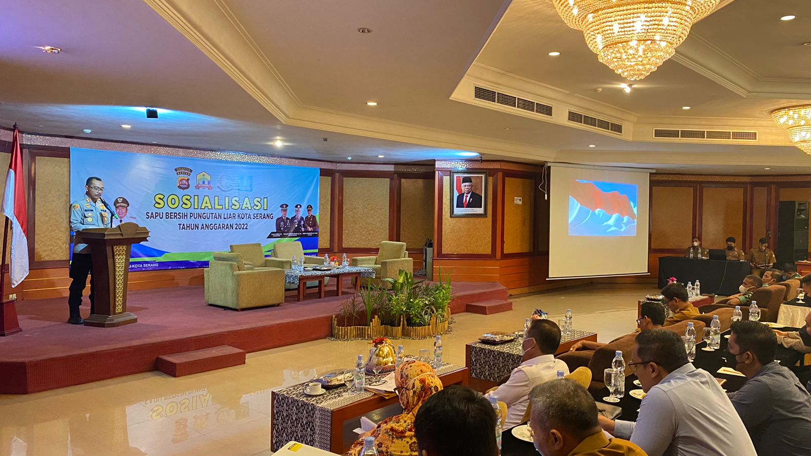 POLRESTA SERKOT_ Wakapolresta Serang Kota AKBP Wahyu Imam Santoso, hadiri Sosialisasi Sapu Bersih Pungutan Liar Kota Serang Tahun Anggaran 2022, ri hotel Ledian Jl. Jend. Sudirman No.88, Sumurpecung, Kec. Serang, Kota Serang.