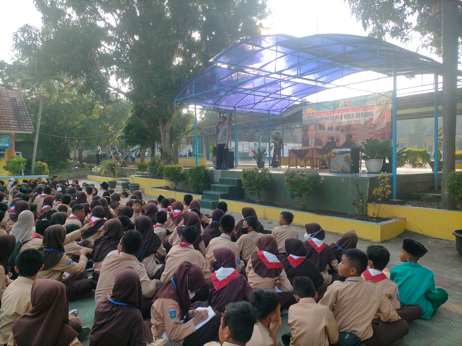 POLRESTA SERKOT, Hari Ke 2 Sekolah Kapolsek Walantaka menghadiri kegiatan di SMPN 8 Kota Serang untuk memberikan materi tentang berbangsa dan bernegara dan kenakalan remaja kepada siswa siswi baru SMP 8 Kota Serang, Selasa (19/7/2022)