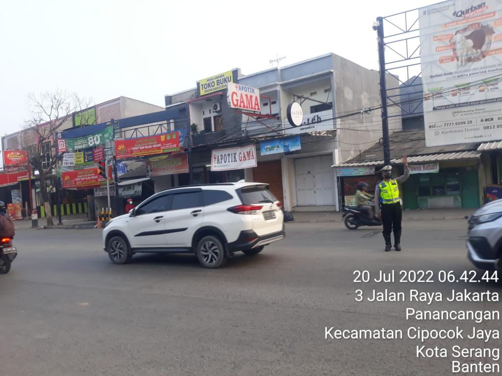 POLRESTA SERKOT, Lantas Polsek berikan rasa aman dan nyaman kepada pengendara kendaraan bermotor di pagi hari Polsek Cipocok Jaya polresta Serkot Polda Banten melaksanakan Pengaturan arus lalu lintas pagi hari di depan terminal pakupatan kel.penancanagan Cipocok Jaya.