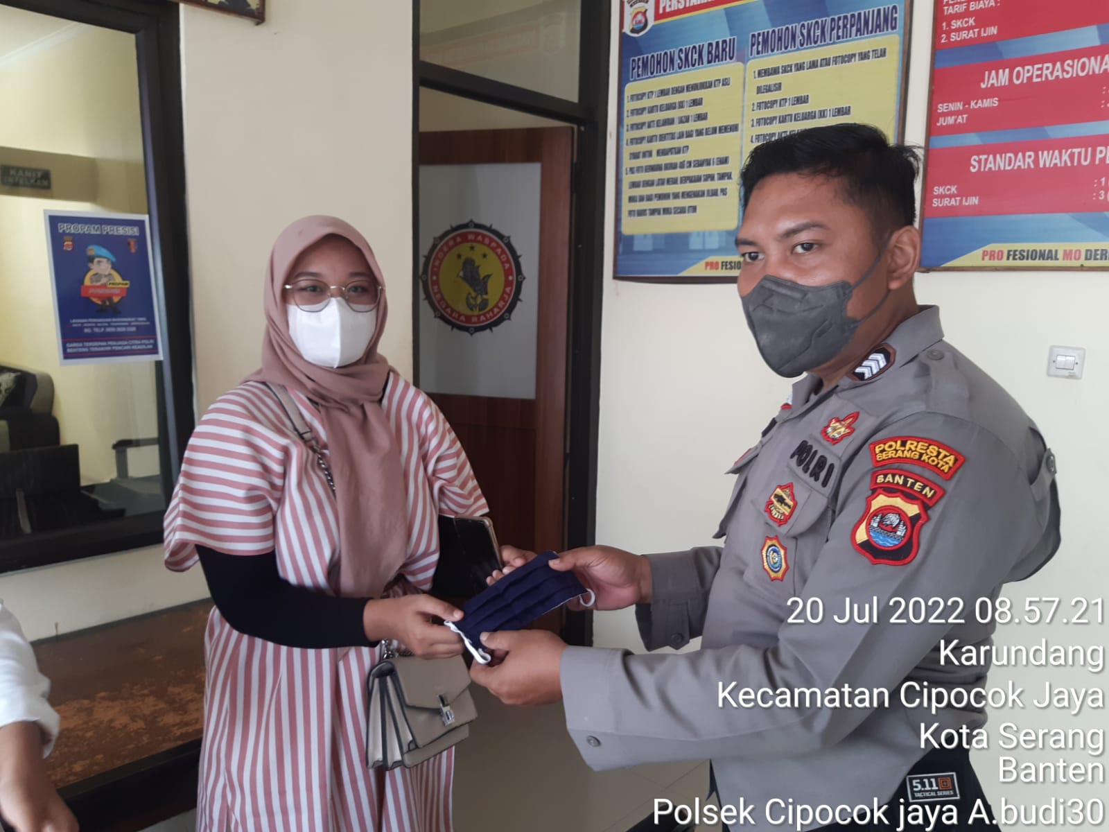 Anggota Polsek Cipocok Jaya Polresta Serkot Brigpol Willy Berikan masker kepada masyarakat untuk memastikan Prokes masih berjalan di Ruang Pelayanan Polsek maupun wilayah hukum Cipocok Jaya Kota Serang .