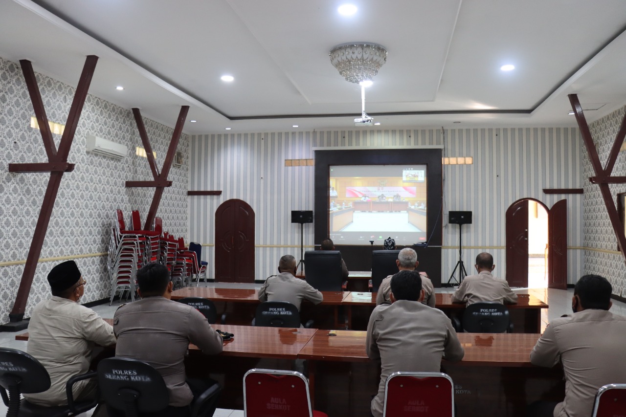 POLRESTA SERKOT_ Satbinmas Polresta Serang Kota dan Kanit Binmas Polsek jajaran Polresta Serang Kota ikuti Vidcon pelatikan dan pengukuhan pengurus Pokdarkamtibmas Polda Banten, di ruang Aula Osvia Polresta Serkot pada Kamis (21/07).