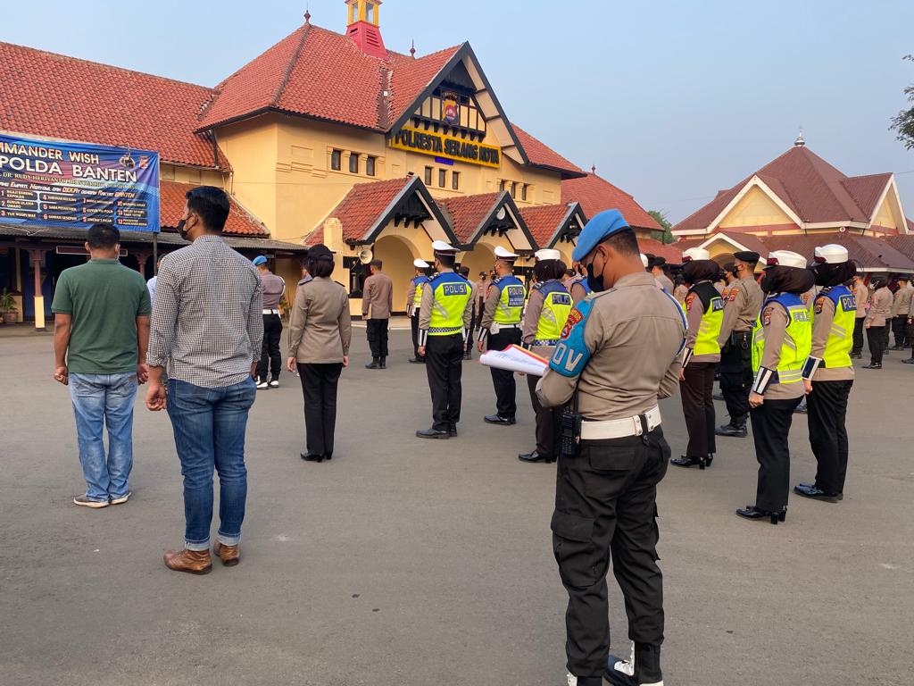 POLRESTA SERKOT_ Personel Propam Polresta Serkot Polda Banten lakukan pengecekan kehadiran personel Polresta Serkot saat apel pagi, Kamis (21/07).