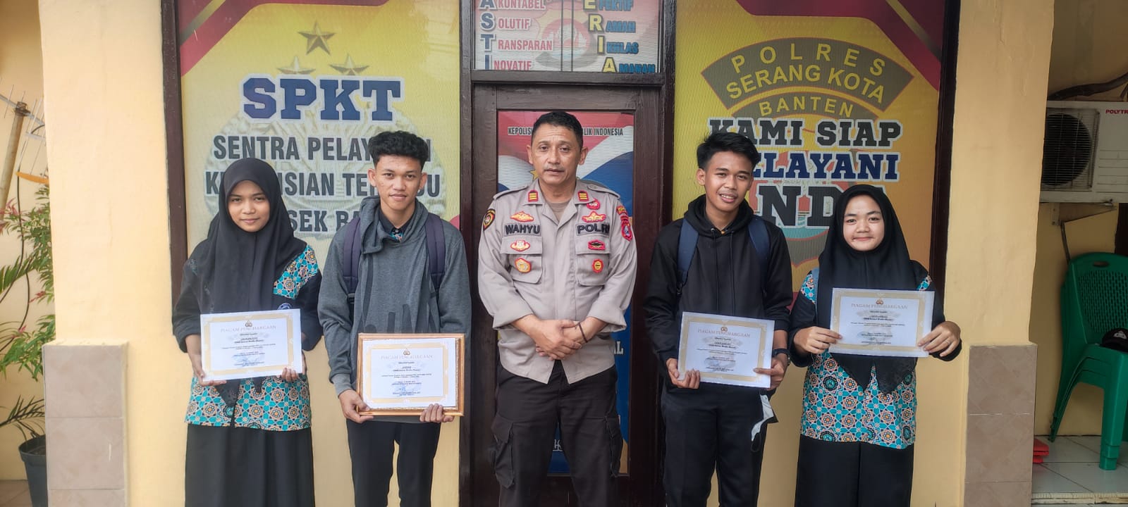 POLRESTA SERKOT | Setelah melaksanakan magang atau Praktek Kerja Lapangan (PKL) Siswa – siswi SMK Nurul Huda Baros Selama 1 Bulan, Kapolsek Baros Polresta Serkot Polda Banten AKP L. Wahyu Bintarna, S.IP menyerahkan sertifikat sebagai tanda selesainya PKL, bertampat di kantor Polsek Baros, Kamis (21/7/2022) pagi.