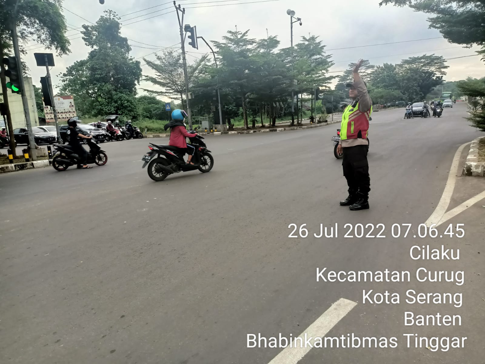 POLRESTA SERKOT_Personel Polsek Curug Polresta Serkot melaksanakan pengaturan lalu lintas pada pagi hari, Agar terciptanya keamanan keselamatan dan ketertiban dalam berlalu lintas.