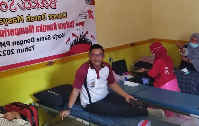POLRES SERKOT – Dalam rangka memperingati HUT RI Ke – 77, Kapolsek Baros Polresta Serkot Polda Banten AKP L. Wahyu Bintarna, S.IP bersama anggota menghadiri kegiatan donor darah yang diselenggarakan oleh PMI (Palang Merah Indonesia) Kab. Serang bertempat di Aula Kecamatan Baros Kab. Serang. (19/08)