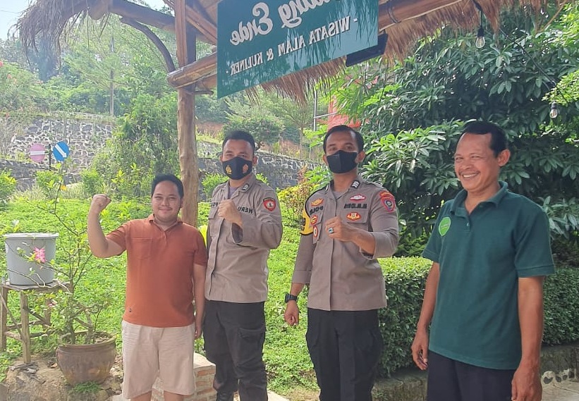 Bripka Heru dan Brigpol Maulana Personel Polsek Taktakan Polresta Serkot Sampaikan himbauan Prokes covid -19 kepada pengunjung tempat wisata dan kuliner Saung Ende.