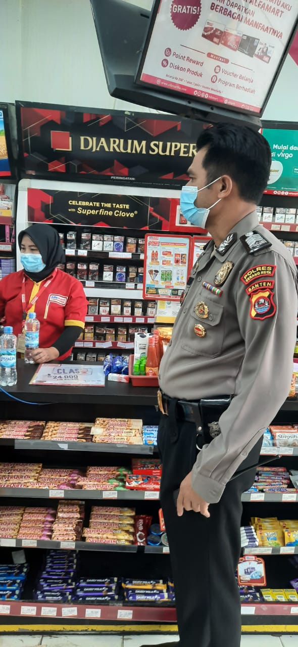 POLRESTA SERKOT – Personil Polsek Taktakan Polresta Serkot Polda Banten Aipda Abdul Aziz bersama Anggota melaksanakan Patroli dialogis dengan mendatangi Alfamart maupun indomart pastikan aman memberikan himbauan Kamtibmas serta mengingatkan kembali himbauan dan edukasi protokol kesehatan kepada pelayan untuk selalu menerapkan 5 M Protokol Kesehatan. Minggu,(21/08/2022)