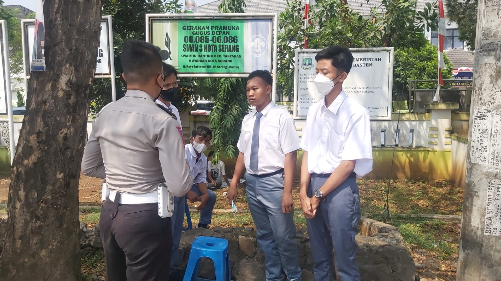 Polresta Serkot- Briptu Hary, selaku personel Polsek Taktakan Polresta Serkot Polda Banten memberikan himbauan kepada para pelajar yang kedapatan sedang kumpul-kumpul, di depan sekolah di Kelurahan Panggung jati Kecamatan Taktakan pada Selasa (23/08/2022)
