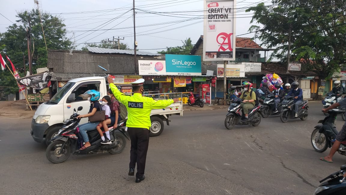 POLRESTA SERKOT – Personel unit Laulintas Polsek Serang Bripka Arfan melaksanakan gatur pagi antisipasi kemacetan pada saat keberangkatan karyawan, anak sekolah, dan warga yang hendak ke Pasar. (23/08)