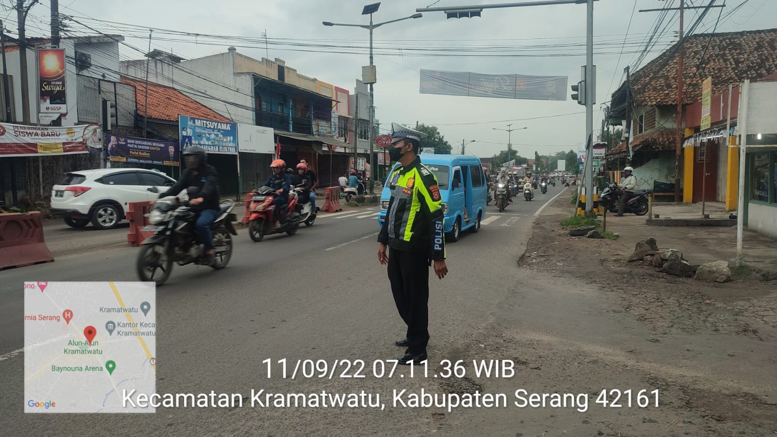 Pengaturan lalu lintas di pagi hari oleh anggota lalu lintas Polsek Kramatwatu Polresta Serkot Bripka Agung Muji dilakukan di Perempatan Jalan Trafic Light Kramatwatu Desa Kramatwatu Kec. Kramatwatu Kab. Serang yang tujuannya guna mencegah kemacetan, kecelakaan lantas, dan antisipasi kriminalitas