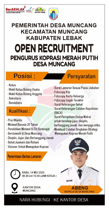 Media infoxpos.com – Lebak – Rabu (14/5/2025) Pemerintah Desa Muncang, Kecamatan Muncang, Kabupaten Lebak, mulai membuka rekrutmen calon pengurus Koperasi Desa Merah Putih, sebuah program yang merupakan bagian dari penguatan ekonomi kerakyatan di tingkat desa.