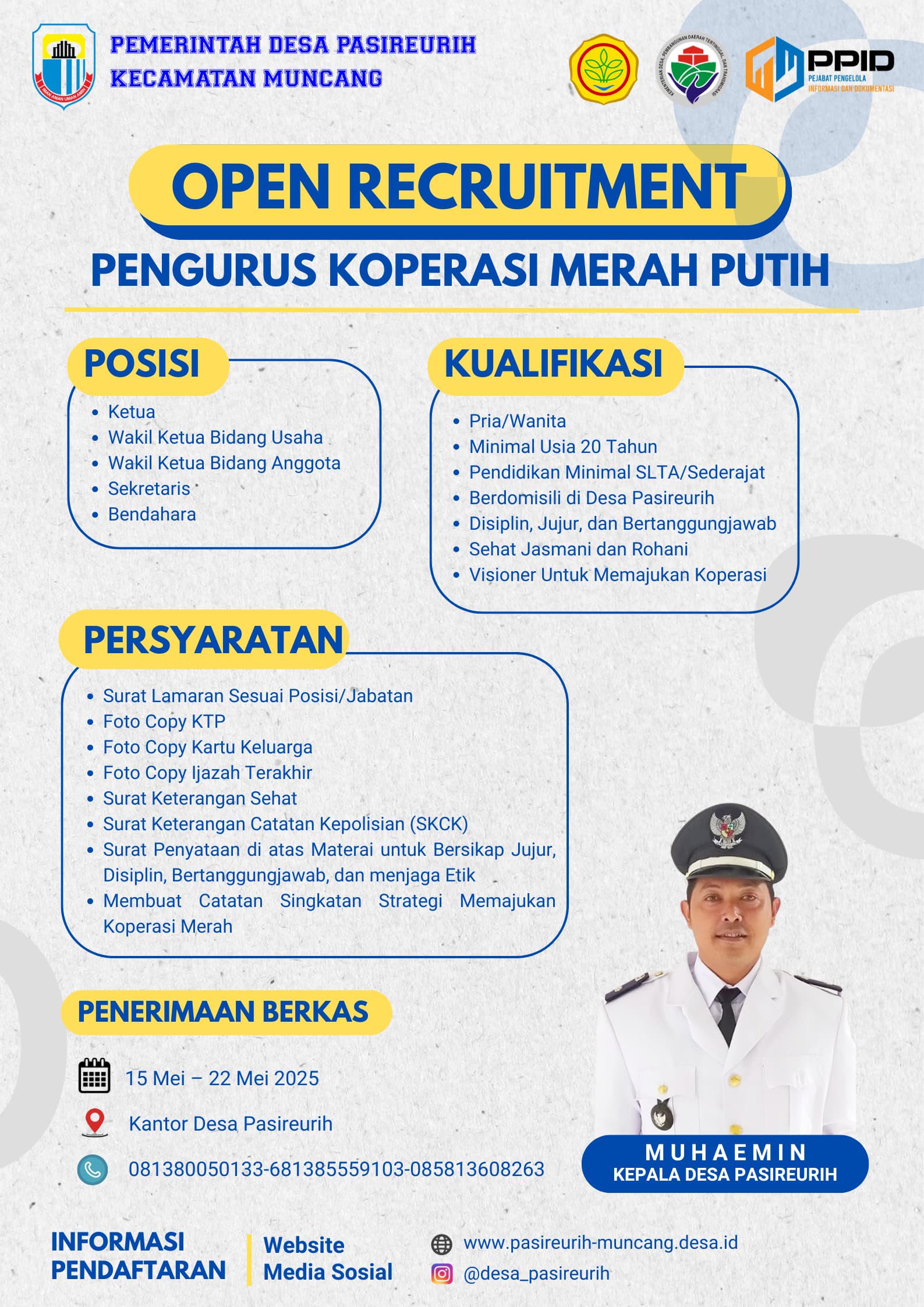 Media infoxpos.com – Lebak – Sabtu (17/5/2025) Pemerintah Desa pasir erih Kecamatan Muncang, Kabupaten Lebak, resmi membuka rekrutmen calon pengurus Koperasi Desa Merah Putih. Program ini merupakan bagian dari upaya penguatan ekonomi kerakyatan di tingkat desa.