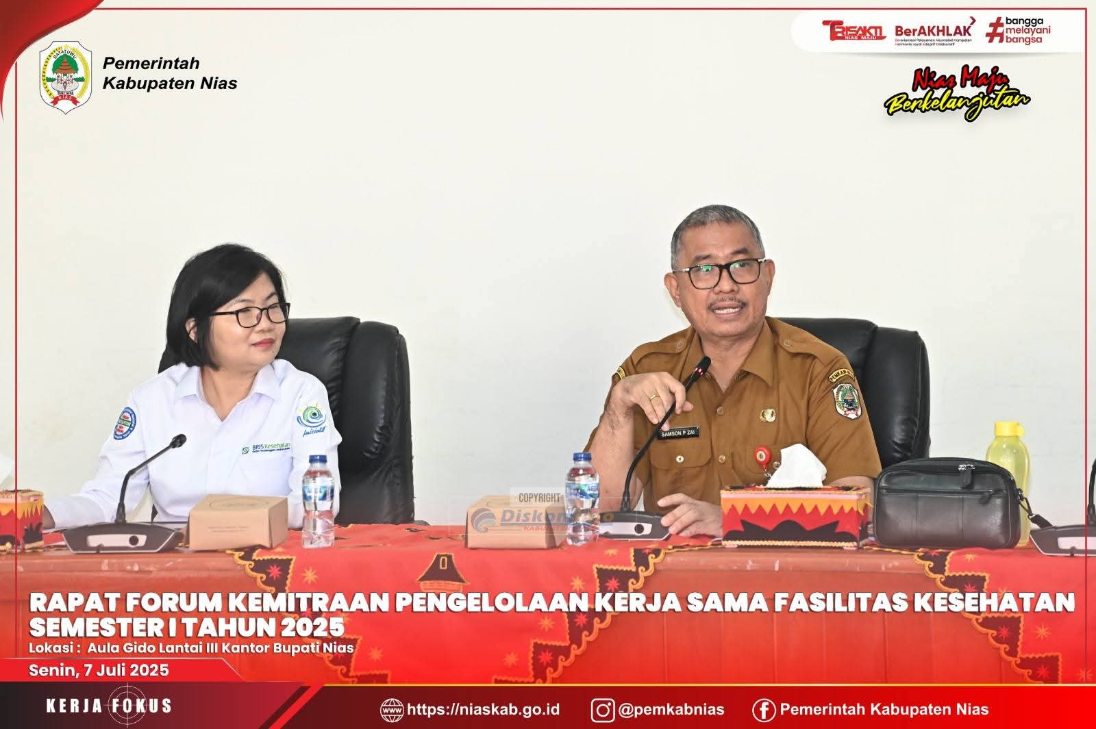 Media Infoxpos.com – Nias – Rapat Forum Komunikasi Kabupaten Nias Semester I Tahun 2025, dalam rangka membahas hal-hal yang terkait dengan cakupan kepesertaan JKN, Monitoring dan Evaluasi Pelayanan Kesehatan serta Rencana Strategis Pelaksanaan Program JKN Tahun 2025 di Kabupaten Nias, bertempat di Aula Gido Lantai III Kantor Bupati Nias.