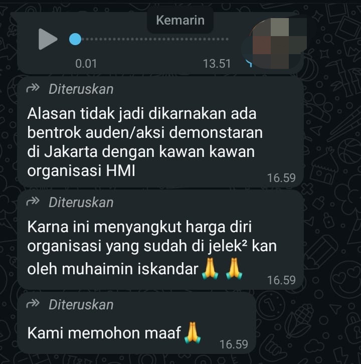 Dikatakan Saepul Bahri Alasan tidak jadi dikarenakan ada bentrok audensi atau aksi demonstrasi di Jakarta dengan kawan kawan organisasi HMI,