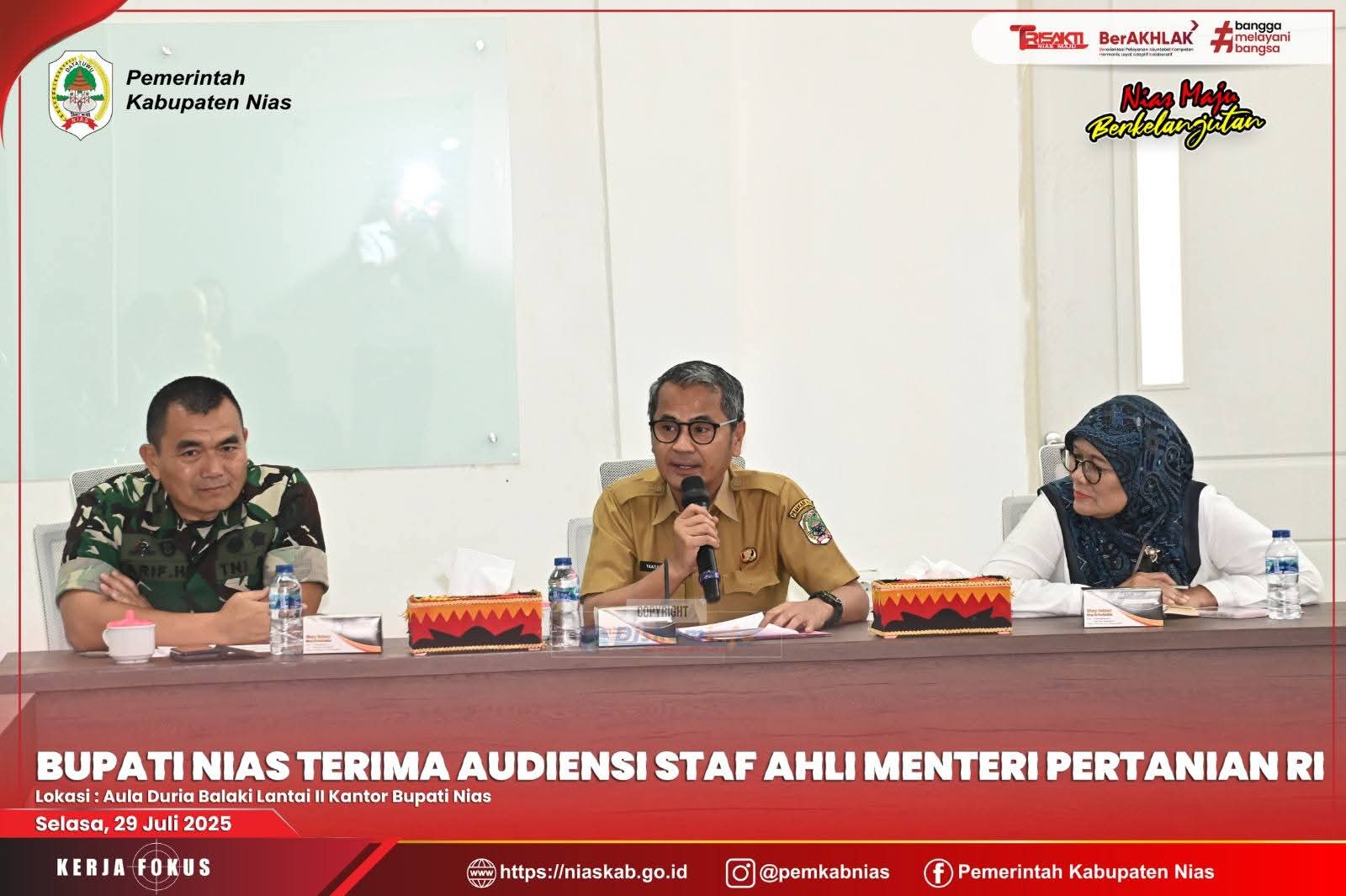 Media Infoxpos.com – Nias – Bupati Nias, Yaatulo Gulo, S.E., S.H., M.Si sambut baik audiensi dari Staf Ahli Menteri Pertanian RI, bertempat di Aula Duria Balaki Lantai II Kantor Bupati Nias. Selasa (29/7/25)