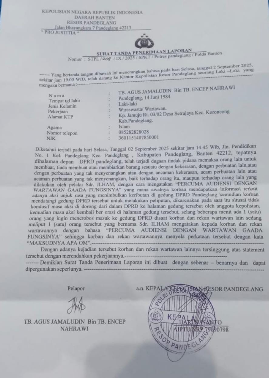 Dengan adanya Surat tanda penerimaan laporan Nomor : STPL/204/IX/2025/SPKT/Polres Pandegkang/Polda Banten resmi melaporkan kepada oknum tersebut.