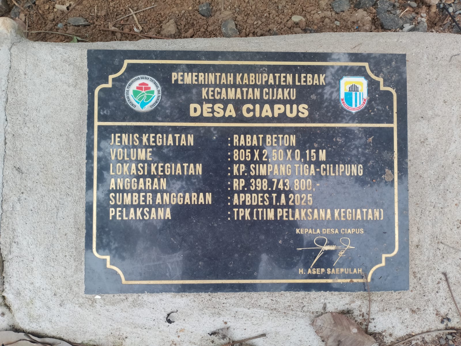 jenis kegiatan rabat beton, Volume : 805 x 2, 50 x 0,15 CM lokasi kegiatan kp simpang tiga-ciapus, Anggaran : Rp.398.743.800, yang bersumber dari anggaran APBDES T.A 2025. pelaksana Tim pelaksana kegiatan (TPK).
