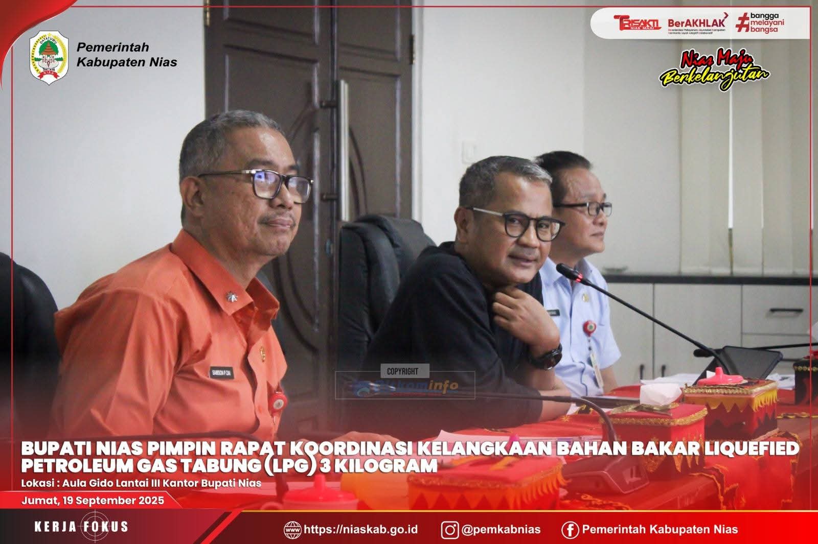 Media Infoxpos.com – Nias – Bupati Nias Yaatulo Gulo, S.E., S.H., M.Si memimpin langsung Rapat Tim Koordinasi Pemantauan, Pengawasan, dan Pengendalian Pendistribusian Liquefied Petroleum Gas (LPG) 3 Kilogram di Aula Gido Lantai III Kantor Bupati Nias. Jum’at (19/9/25)