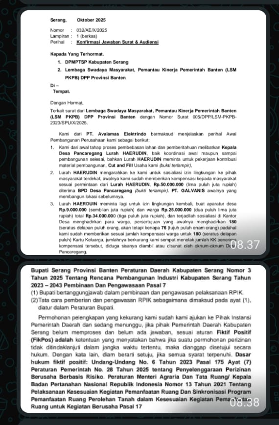 Media infoxpos.com – Serang – Rabu, (22/10/2025). Sekjen LSM Pemantau Kinerja Pemerintah Banten (PKPB), menanggapi surat yang dilayangkan oleh Humas PT.Avalamas Elektrindo. Pasalnya, Humas PT.Avalamas Elektrindo, menuding oknum Desa Pancaregang menyunat dana sosialisasi, dan terkesan menyalahkan pihak Dinas Penanaman Modal dan Perizinan Terpadu Satu Pintu (DPMPTSP) Kabupaten Serang, lantaran tidak memproses perizinan yang diajukan. Rabu 22 Oktober 2025