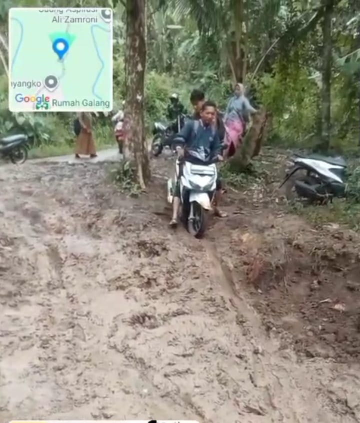 Jalan yang seharusnya menjadi urat nadi ekonomi dan pendidikan warga kini berubah menjadi kubangan lumpur. Tak hanya sulit dilalui kendaraan roda dua, bahkan kendaraan roda empat pun sering terjebak saat melintas.