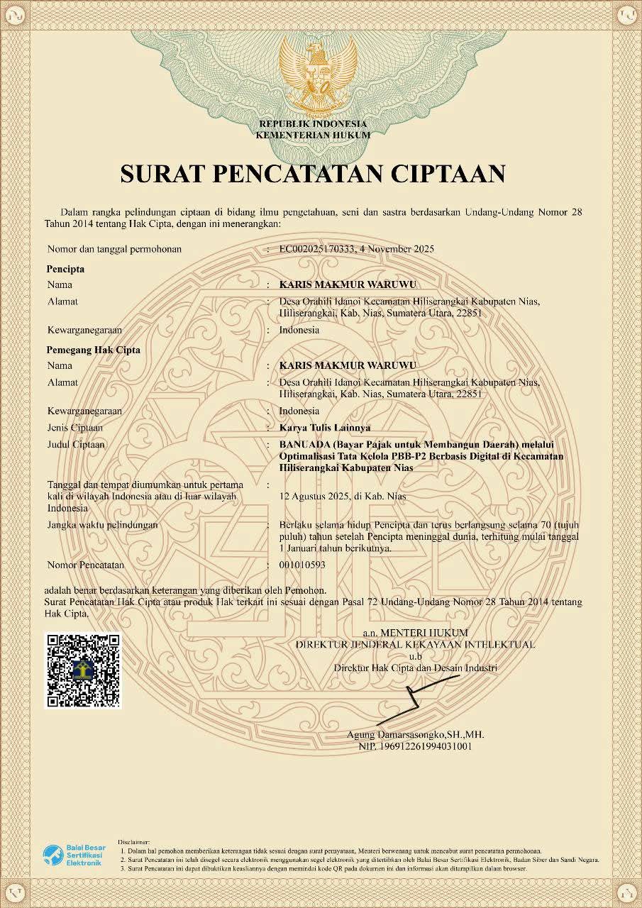 Media Infoxpos.com – Nias – Inovasi BANUADA (Bayar Pajak untuk Membangun Daerah) melalui Optimalisasi Tata Kelola PBB-P2 Berbasis Digital di Kecamatan Hiliserangkai Kabupaten Nias yang digagas oleh Camat Hiliserangkai, Karis Makmur Waruwu, kini resmi terdaftar pada Hak Kekayaan Intelektual (HKI) di Kementerian Hukum dan Hak Asasi Manusia Republik Indonesia (Kemenkumham RI).