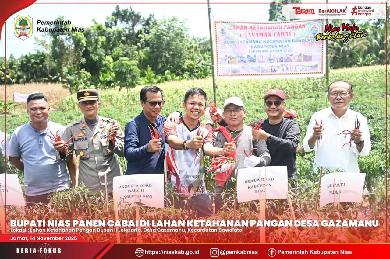 Media Infoxpos.com – Nias – Jumat, 14 November 2025. Bupati Nias Yaatulo Gulo, S.E., S.H., M.Si bersama Wakil Bupati Nias, Ketua DPRD dan Sekretaris Daerah serta Kepala OPD melaksanakan Panen Cabai di Lahan Ketahanan Pangan Dusun II Lolozaria, Desa Gazamanu, Kecamatan Bawolato.