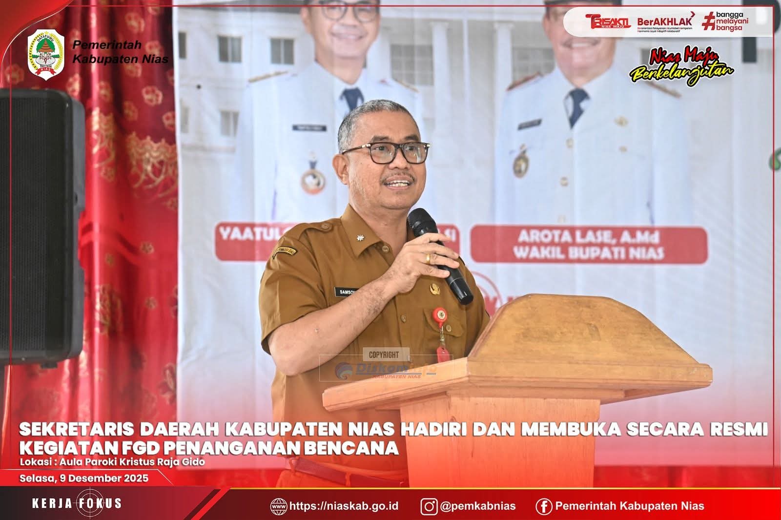 Media Infoxpos.com – Nias – Selasa, 09 Desember 2025. Sekretaris Daerah Kabupaten Nias Samson P. Zai, S.H., M.H menghadiri sekaligus membuka secara resmi kegiatan FGD bertema “Peningkatan Partisipasi Masyarakat dan Dunia Usaha dalam Penanganan Pascabencana di Kabupaten Nias” yang digelar di Aula Paroki Kristus Raja Gido.