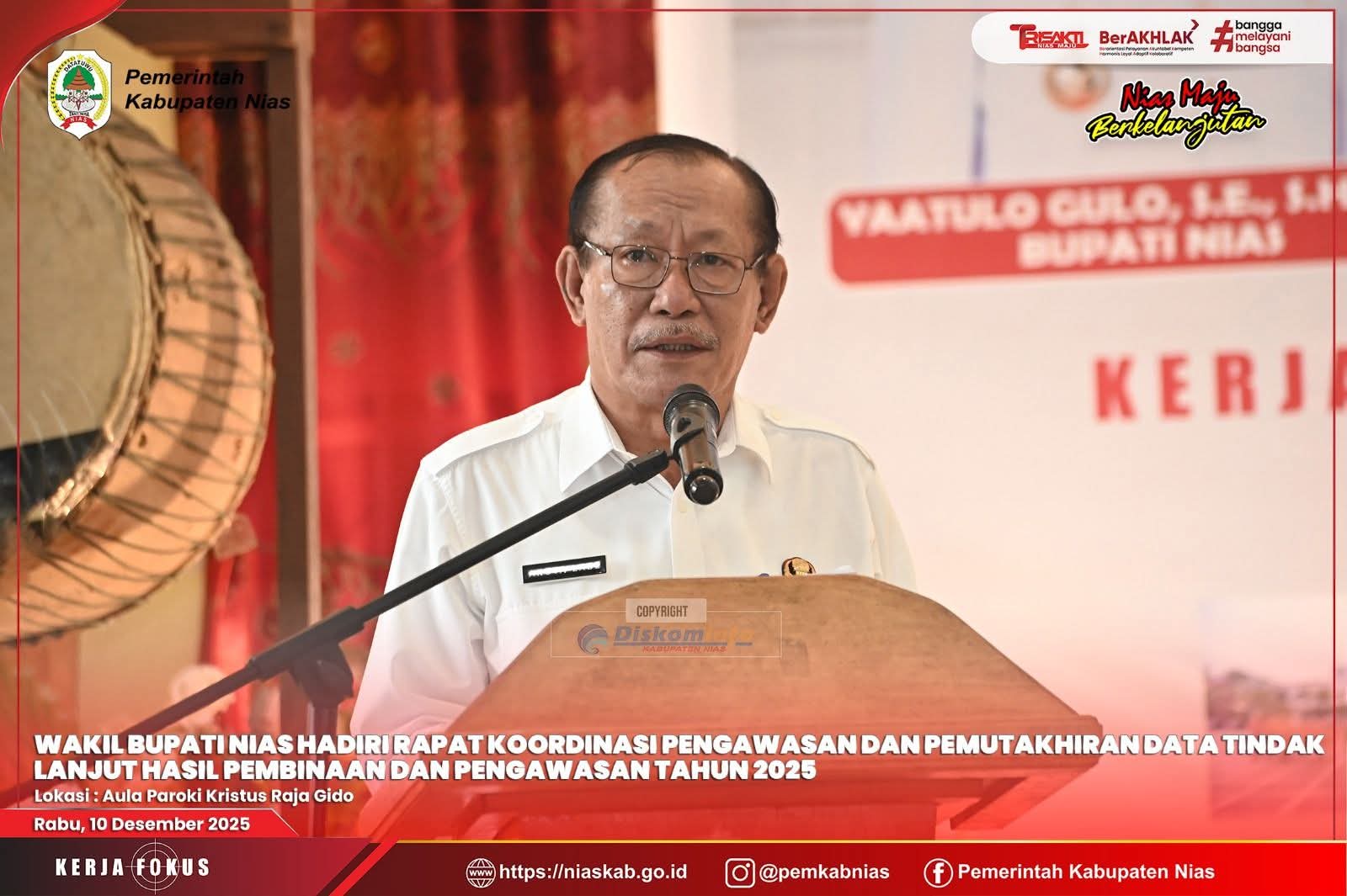 Media Infoxpos.com – Nias – Rabu, 10 Desember 2025. Wakil Bupati Nias Arota Lase, A.Md menghadiri Rapat Koordinasi Pengawasan dan Pemutakhiran Data Tindak Lanjut Hasil Pembinaan serta Pengawasan Inspektorat Daerah Kabupaten Nias yang dilaksanakan di Aula Paroki Kristus Raja Gido, Desa Hiliweto Gido, Kecamatan Gido.