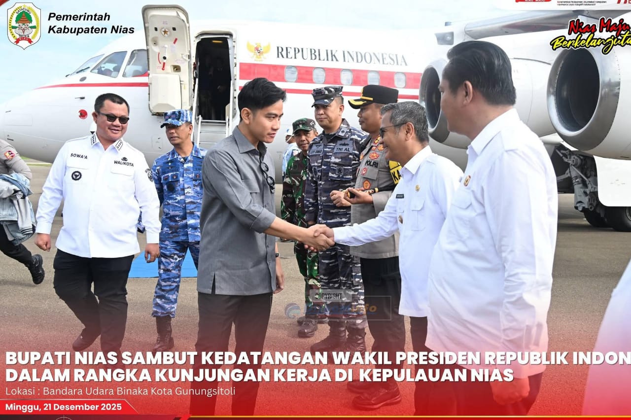 Media Infoxpos.com – Nias – Bupati Nias Yaatulo Gulo, S.E., S.H., M.Si menyambut secara langsung kedatangan Wakil Presiden Republik Indonesia dalam rangka kunjungan kerja di Kepulauan Nias. Penyambutan berlangsung di Bandara Udara Binaka, Kota Gunungsitoli, Minggu (21/12/25)