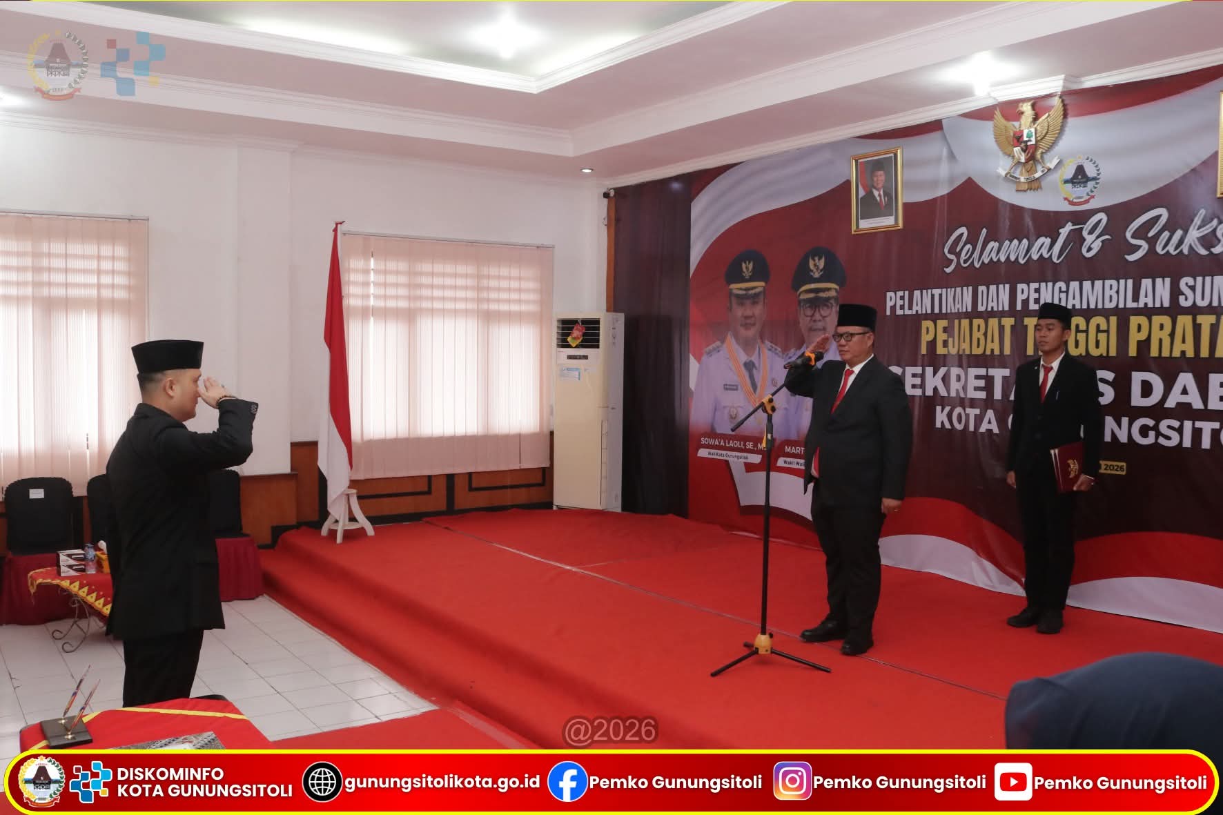 Media Infoxpos.com – Gunungsitoli – Wali Kota Gunungsitoli, Sowa’a Laoli, S.E., M.Si., melantik dan mengambil sumpah/janji jabatan Sekretaris Daerah Kota Gunungsitoli Andhika P. Laoly, SSTP., M.Si., CGCAE yang dirangkaikan dengan acara serah terima jabatan, bertempat di Ruang Rapat II Kantor Wali Kota Gunungsitoli, Jumat (30/1/26).
