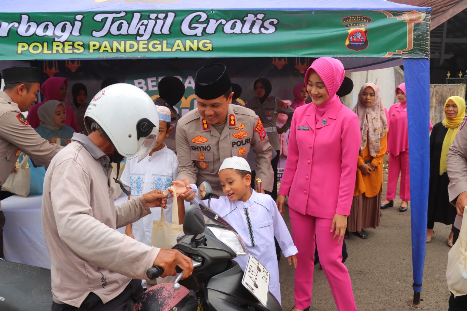 Kegiatan tersebut dipimpin langsung oleh Kapolres Pandeglang AKBP Dr. Dhyno Indra Setyadi, S.I.K., M.Si. bersama Ketua Bhayangkari Cabang Pandeglang Ny. Ledy Dhyno. Turut hadir dalam kegiatan tersebut para Pejabat Utama (PJU) Polres Pandeglang, personel Polres, serta pengurus Bhayangkari Cabang Pandeglang yang bersama-sama turun langsung membagikan paket takjil kepada para pengendara roda dua, roda empat, hingga pejalan kaki yang melintas.