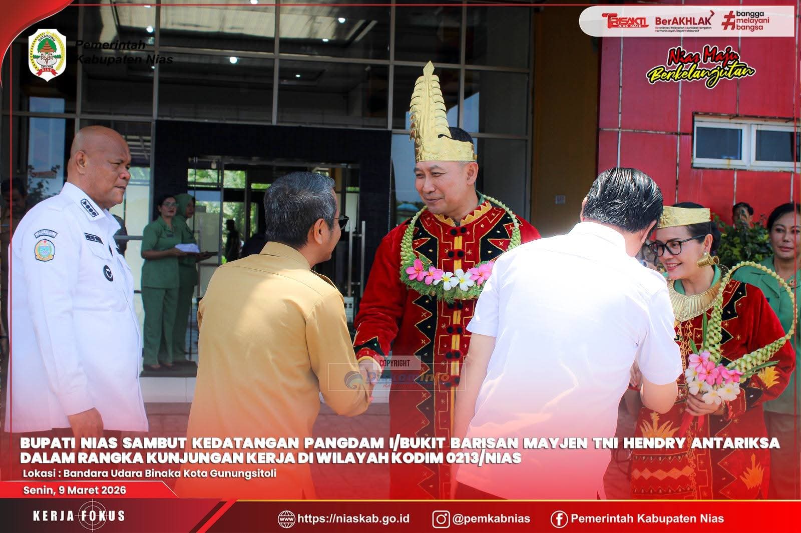 Media Infpxpos.com – Nias – Senin, 09 Maret 2026. Bupati Nias Yaatulo Gulo, S.E., S.H., M.Si menyambut kedatangan Pangdam I/Bukit Barisan, Hendy Antariksa, bersama Ketua Persit KCK Daerah I/Bukit Barisan, Linda Hendy Antariksa, di Bandar Udara Binaka.
