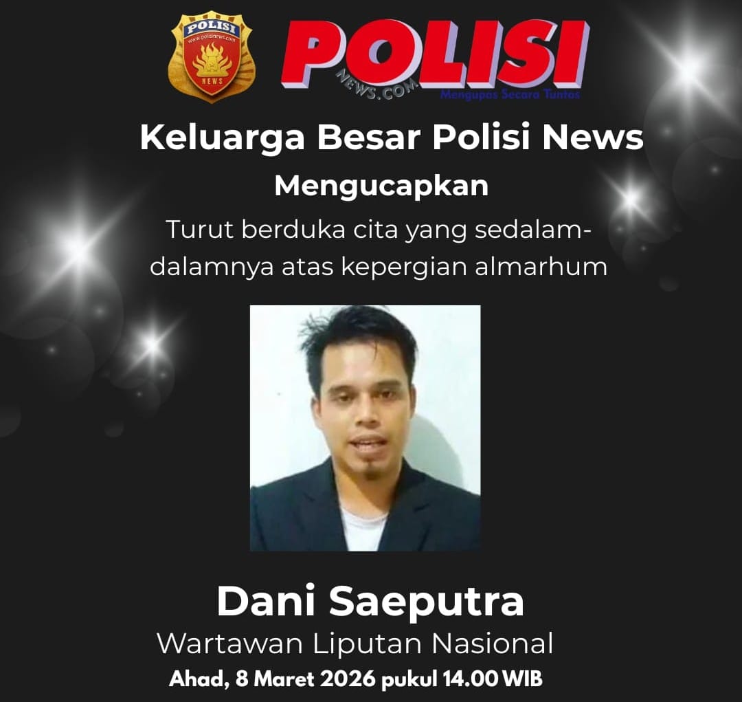 POLISINEWS.com | JAKARTA. Keluarga besar Polisinews.com mengucapkan rasa duka cita yang mendalam atas berpulangnya saudara almarhum Dani Saeputra, seorang wartawan Liputan Nasional yang dikenal dengan semangat kerja tinggi dan sikap yang baik. Almarhum meninggal dunia pada hari Ahad (8/3/2026) pukul 14.00 WIB.