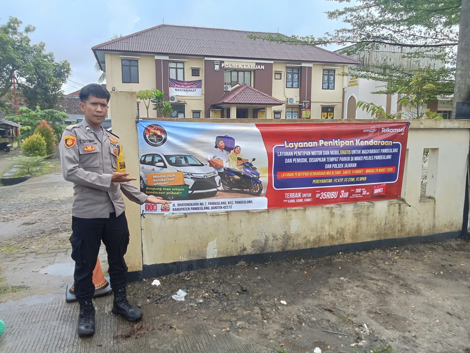 Untuk menjamin keselamatan dan kenyamanan pemudik, Polsek Labuan melakksanakan beberapa kegiatan dan layanan untuk masyarakat. Atas arahan dan petunjuk Kapolres Pandeglang AKBP Dr. H. DHYNO INDRA SETIADY S.I.K., M.Si. melalui Kapolsek Labuan AKP Badri Hasan, S.M., M.M. Polsek membuka layanan penitipan kendaraan gratis bagi para pemudik yang pulang kampung dengan menggunakan sarana transportasi lainnya.