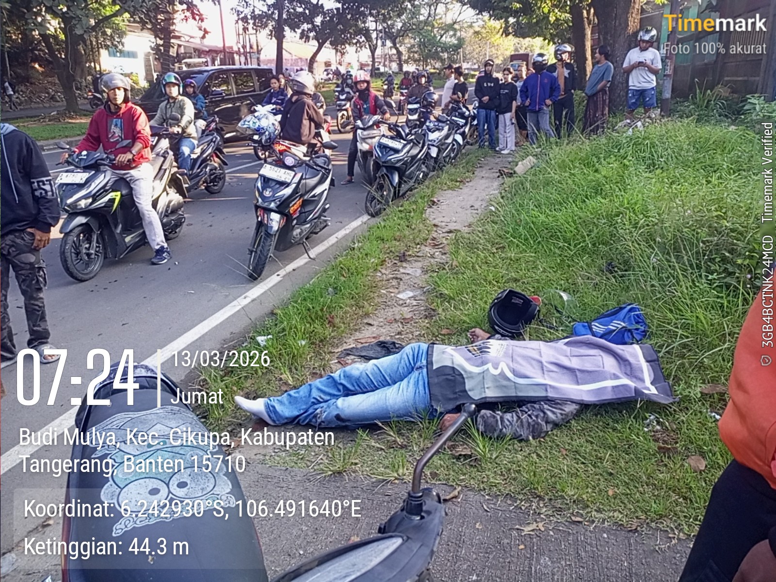 Media Infoxpos.com – Tangerang — Seorang pengendara sepeda motor Yang belum di ketahui identitasnya meninggal dunia setelah hilang kendali di depan Toko Garuda Baja Nusantara, Budi Mulya, Kec. Cikupa, Kabupaten Tangerang, Banten.Jum’at 13 Maret 2026 sekitar pukul 07.20 WIB. Kecelakaan tersebut melibatkan sepeda motor Bebek Suzuki berwarna merah yang dikendarai korban.