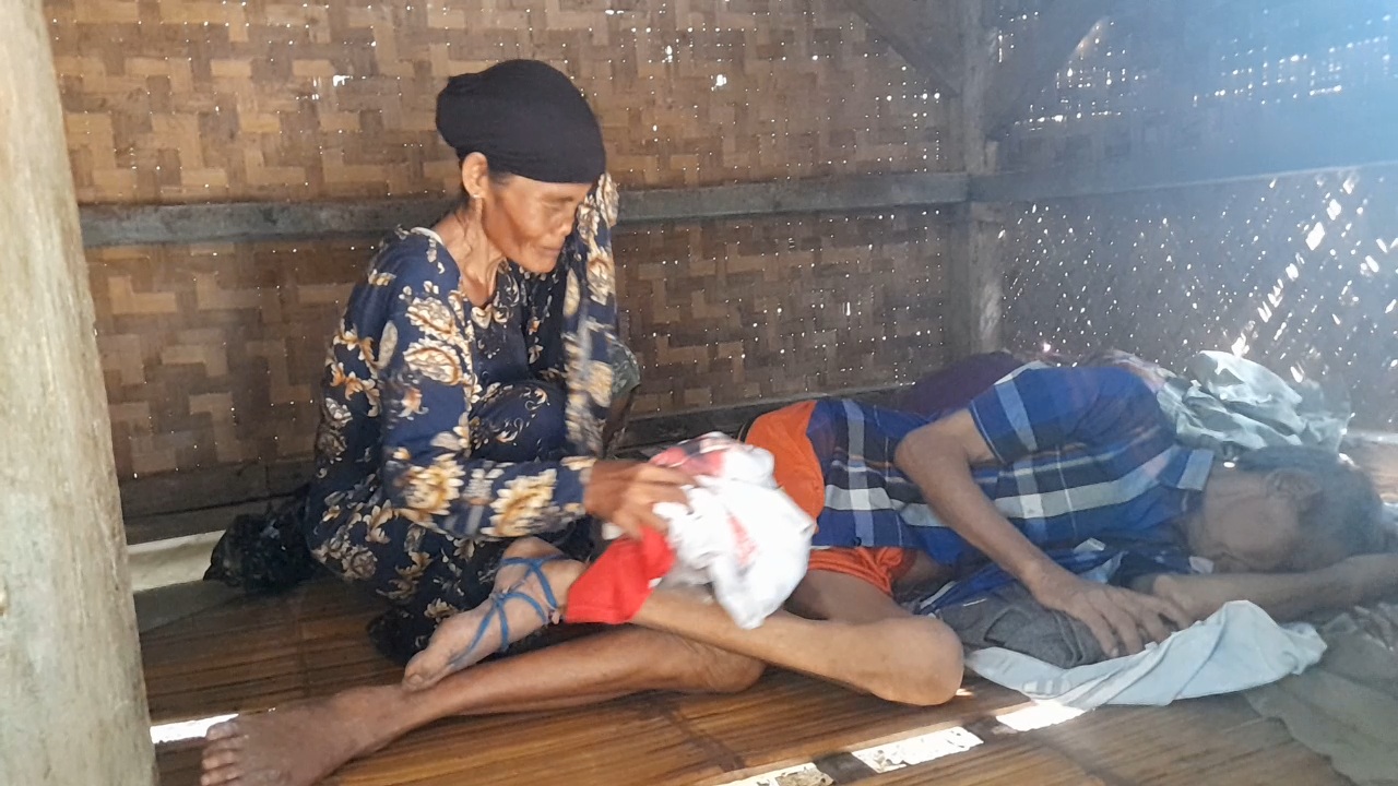 Potret kondisi tersebut tergambar jelas di dalam gubuknya. Saminah terlihat setia merawat sang suami yang terbaring lemah di atas lantai bambu. Dengan penuh kesabaran, ia mengusap dan merapikan tubuh suaminya yang tak lagi mampu bergerak normal, di tengah ruang sempit tanpa fasilitas memadai.